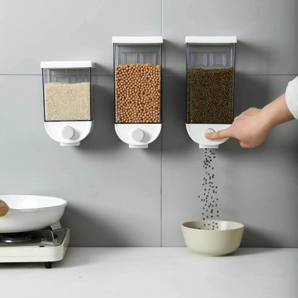 Zidni dozator za namirnice se postavlja bez bušenja na zid, što će napraviti više mesta na policama! Kapaciteti dozera se savršeno slažu sa veličinama pakovanja hrane – posle sipanja ne ostaje višak koji mora da se skladišti sa strane!